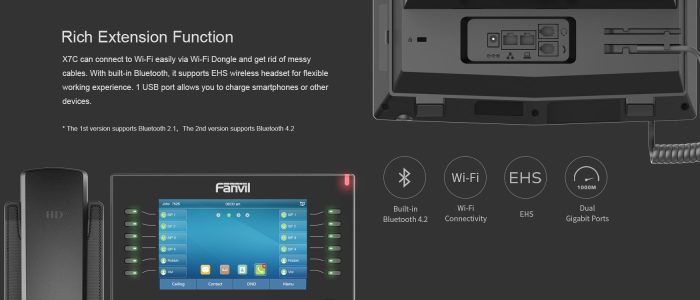 With a modern, clear design, Fanvil X7C is a high-end enterprise IP phone for business users who need immediate access to all of their important information. In addition to a 5-inch high-resolution colour screen, the telephone also features 20 SIP lines, HD audio with Opus support, up to 60 DSS keys (12 physical), Built-in Bluetooth, Wi-Fi connectivity and more!